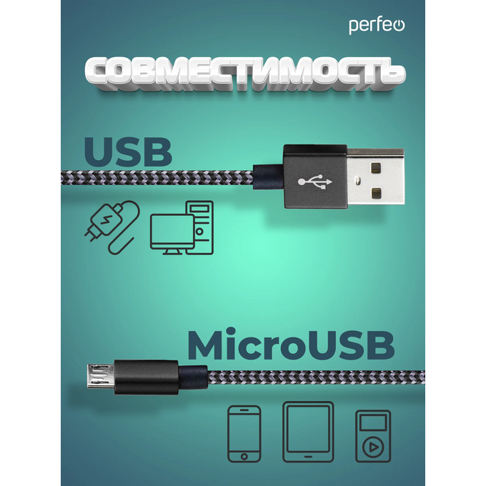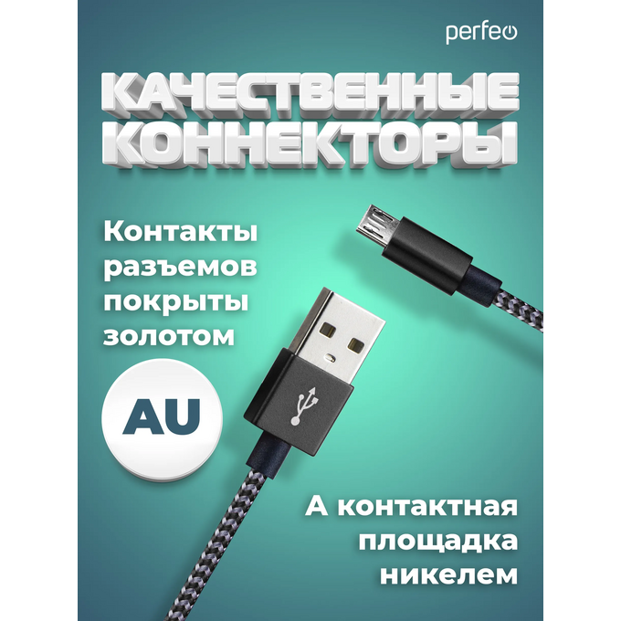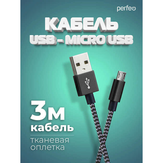 Кабель PERFEO USB A вилка - Micro USB вилка, черно-белый, длина 3 м. (U4802)