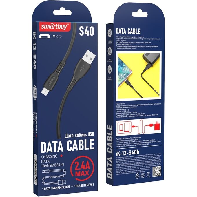 Кабель Smartbuy iK-12-S40b MicroUSB, 2.4А, 1м черный