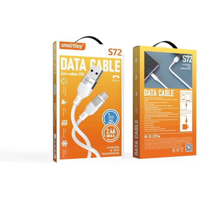 Кабель Smartbuy iK-12-S72w MicroUSB, 2.4А, сил, 1м белый