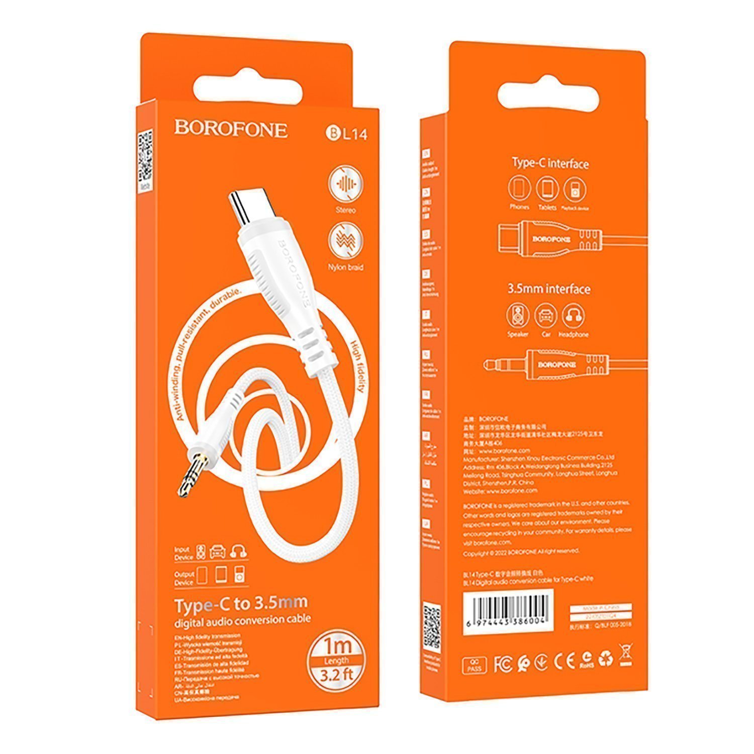 Кабель Type-C - 3.5mm Borofone BL14 100см (white) (242839)