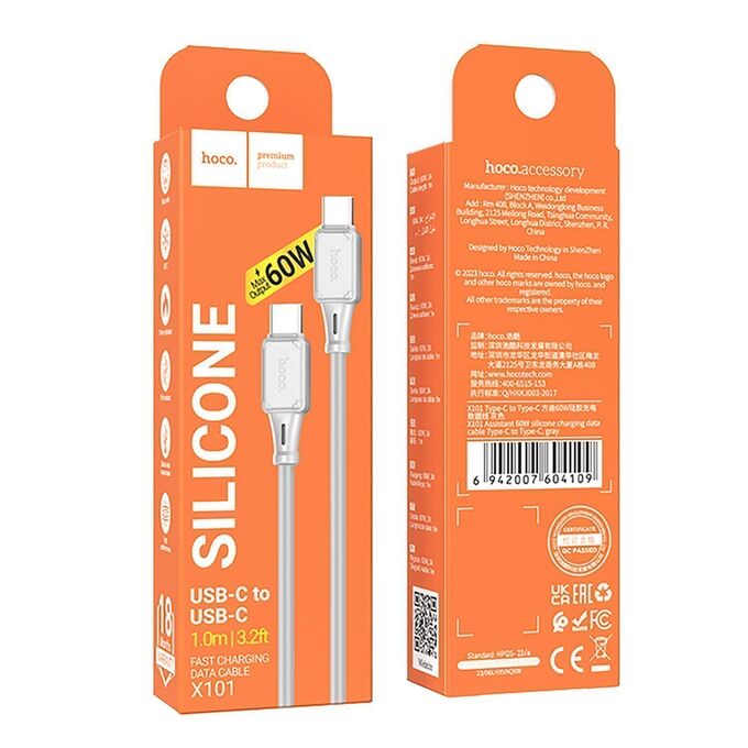 Кабель Type-C - Type-C Hoco X101 Assistant PD 60W 100см 3A (gray) (240325)