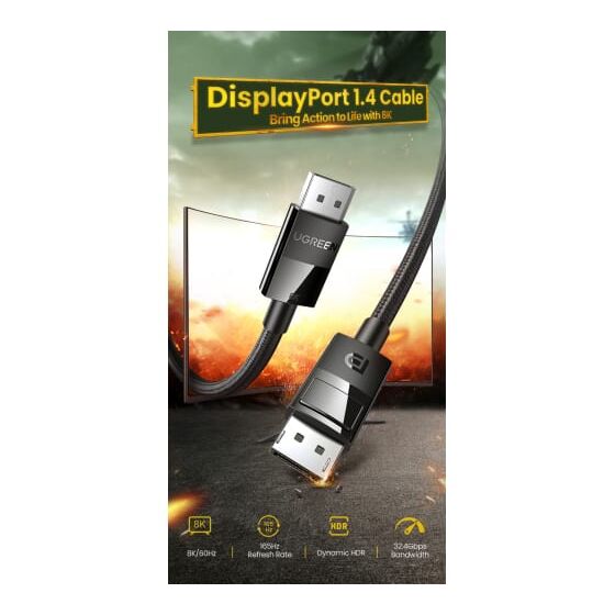 Кабель UGREEN DP114 80391 DP 1.4 Male to Male Plastic Case Braided Cable 1,5m Black
