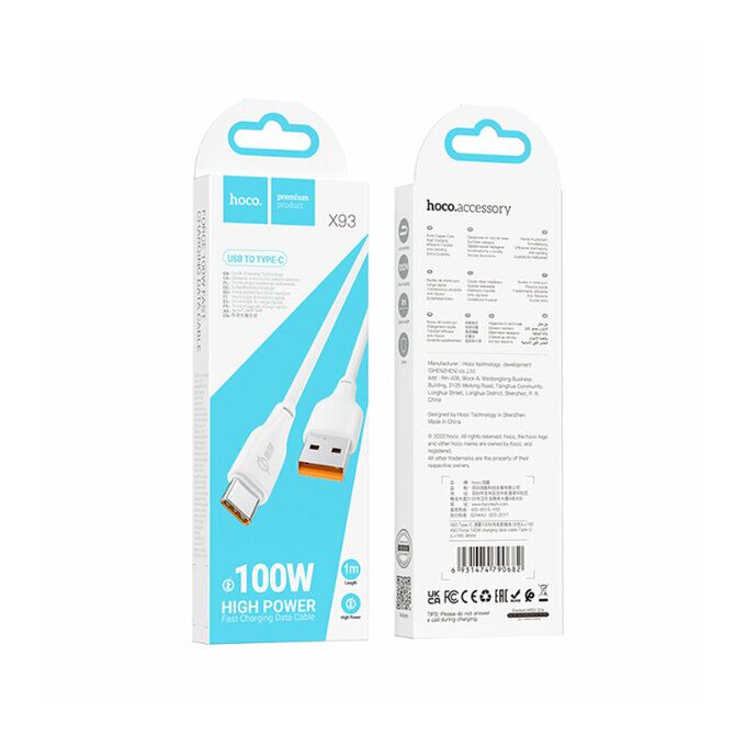 Кабель USB - Type-C HOCO X93 Force, 1.0м, 3.0A, PD100Вт, пластик, цвет: белый (1/25/250)