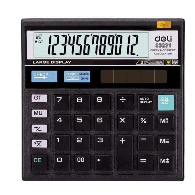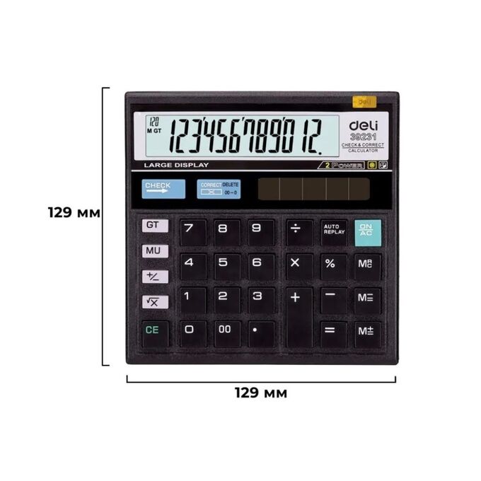 Калькулятор настольный, компактный, E39231, 129x129 мм, черныйНастольный калькулятор Deli 39231 - незаменимый помощник в офисе, школе и дома. Компактный размер, эргономичная форма, удобные кнопки. Оптимальный набор функций поможет автоматизировать расчеты: вычисление наценки, независимая память, расчет процентов, вычисление квадратного корня, итоговое суммирование. Калькулятор в пластиковом корпусе, имеет большой 12-разрядный жидкокристаллический экран. Двойное питание. Размеры: 129х129х25 мм. В комплекте 1 батарейка LR54. С кнопкой коррекции последнего введенного значения. 2IKZ10