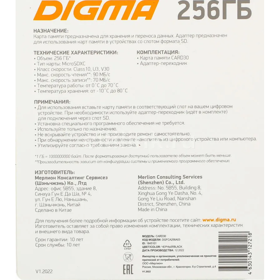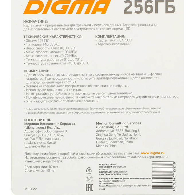 Карта памяти Digma Card30 (DGFCA256A03) microSDXC 256Gb Class10 + adapter