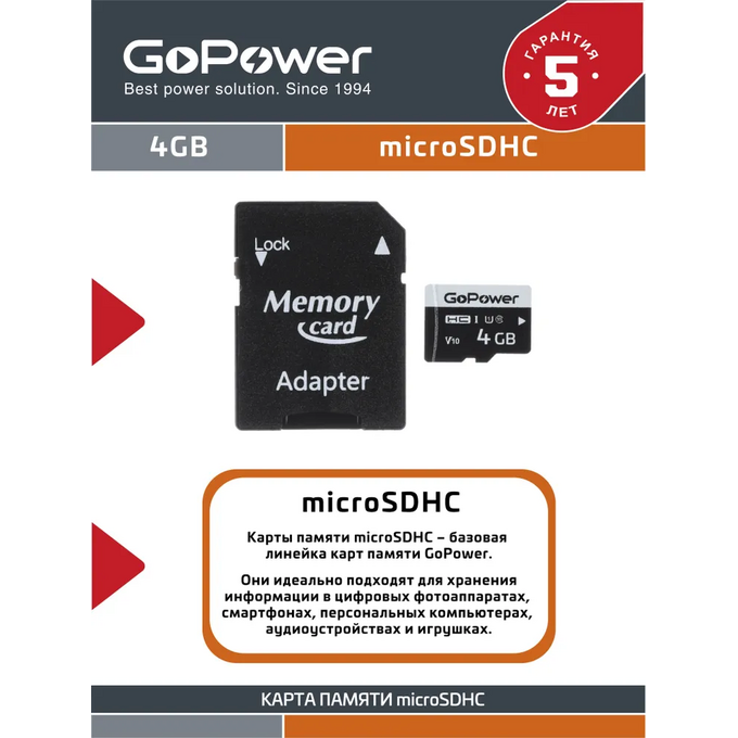 Карты памяти microSDHC – это базовая линейка карт памяти GoPower, они идеально подходят для хранения информации в цифровых фотоаппаратах, смартфонах, персональных компьютерах, аудиоустройствах и игрушках.