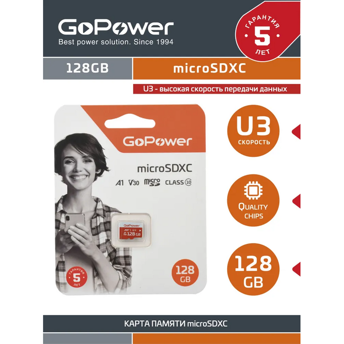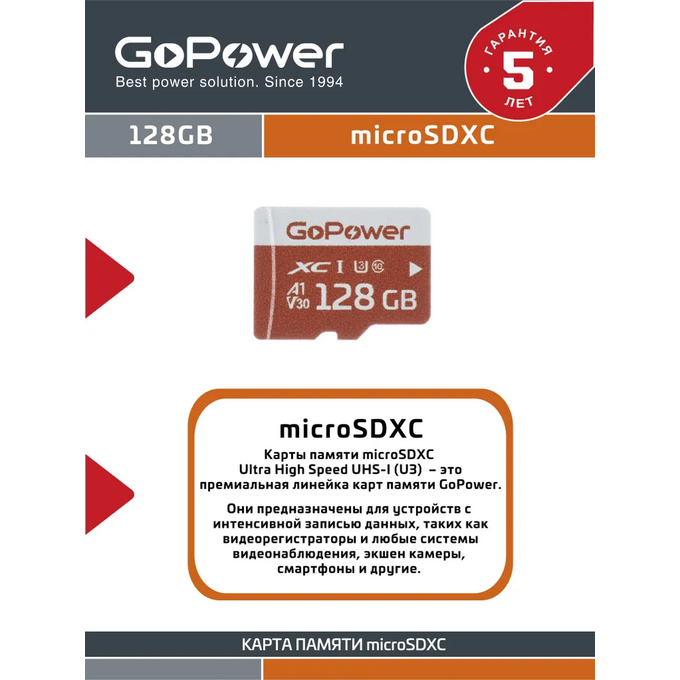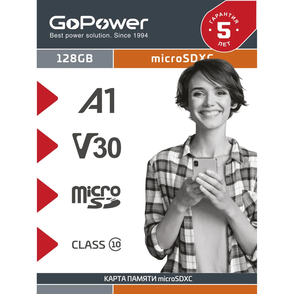 Карта памяти GoPower 00-00025683 microSD 128GB Class10 UHS-I (U3) 100 МБ/сек V30 без адаптера