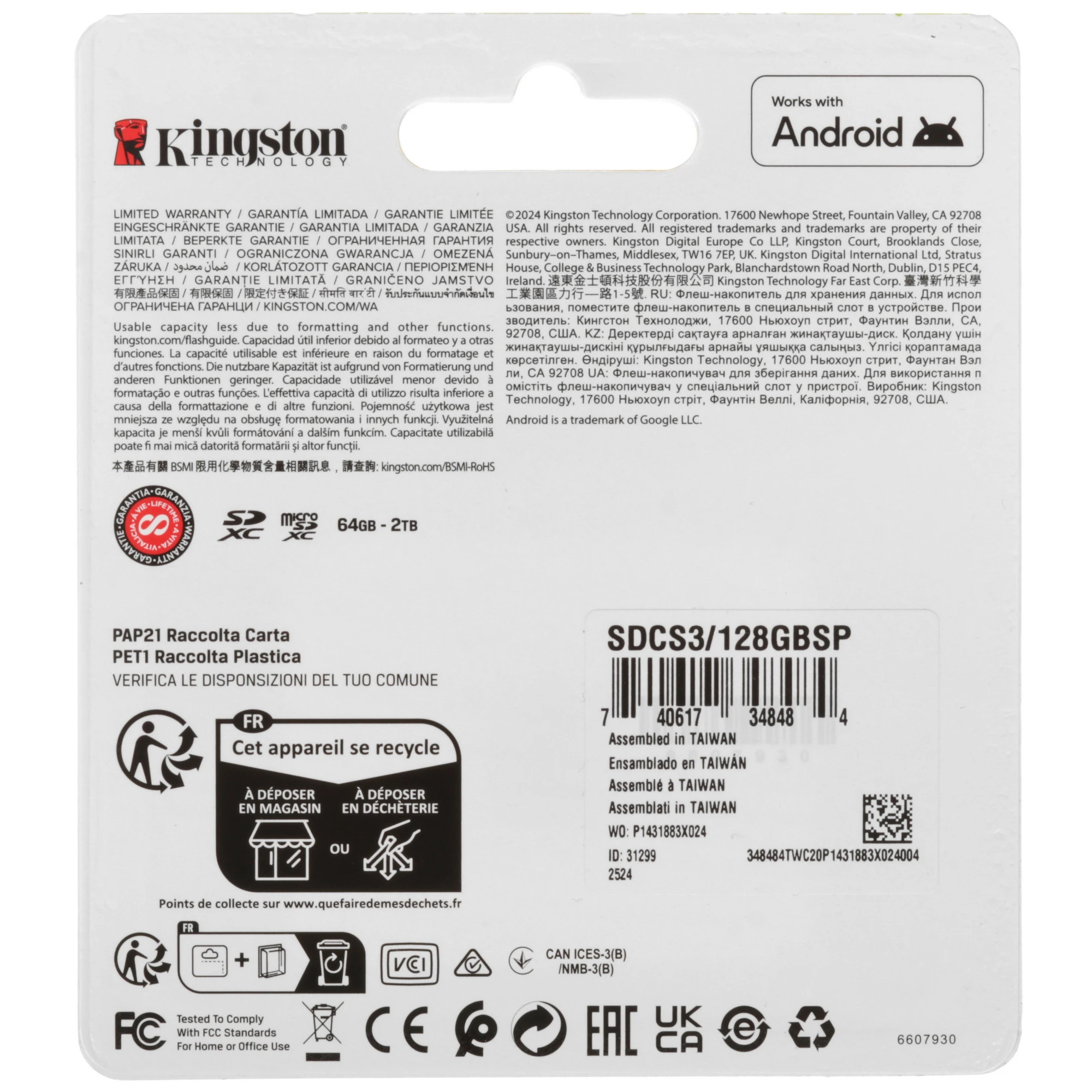 Карта памяти Kingston microSDXC 128 ГБ [SDCS3/128GBSP] соответствует классам скорости A1, UHS Class 1 и Video Class 10. Изделие предназначено для смартфонов, фотокамер и других устройств.