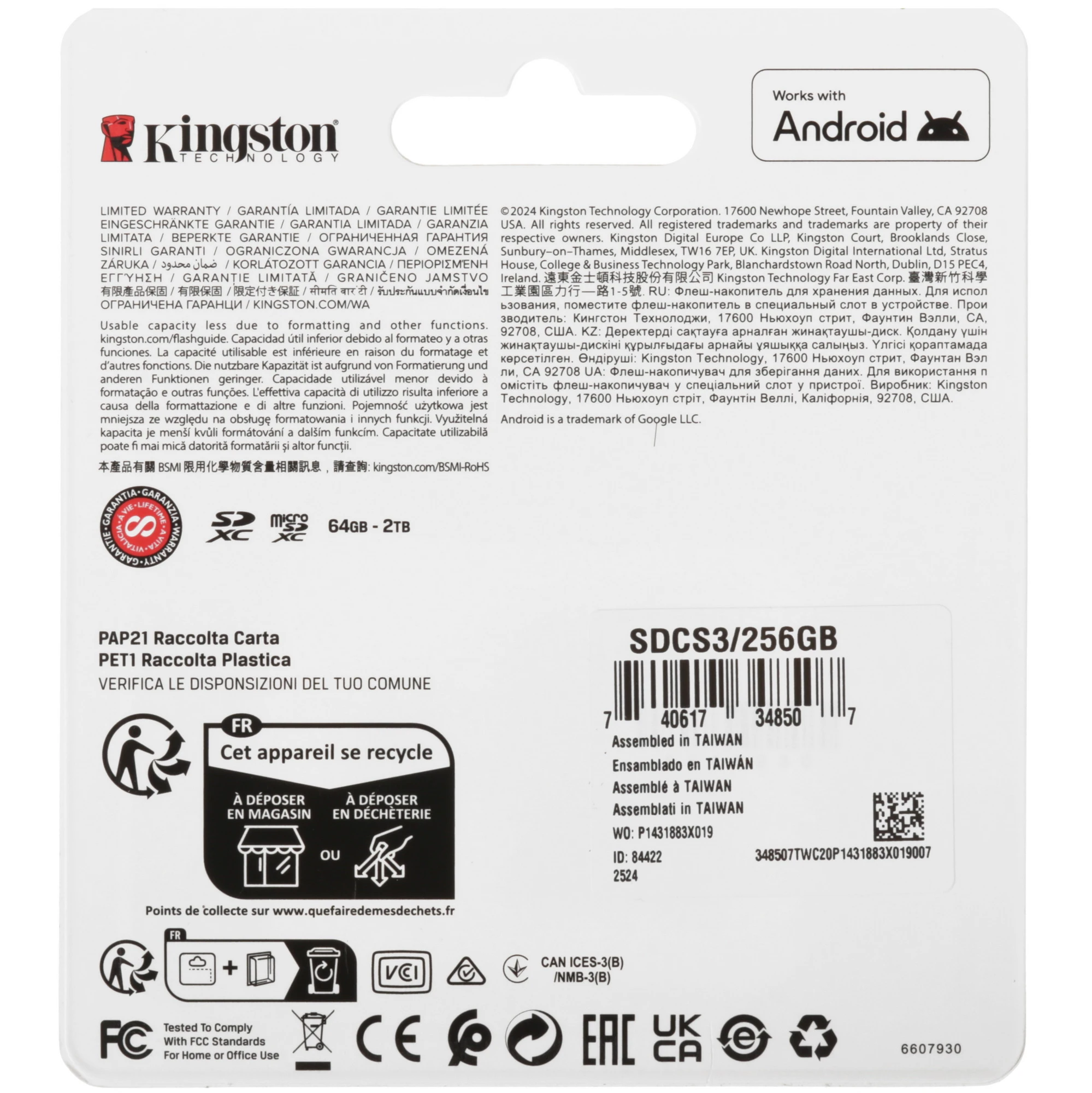 Карта памяти Kingston microSDXC 256 ГБ [SDCS3/256GB] соответствует классам скорости A1, UHS Class 1 и Video Class 10. Изделие предназначено для смартфонов, фотокамер и других устройств.