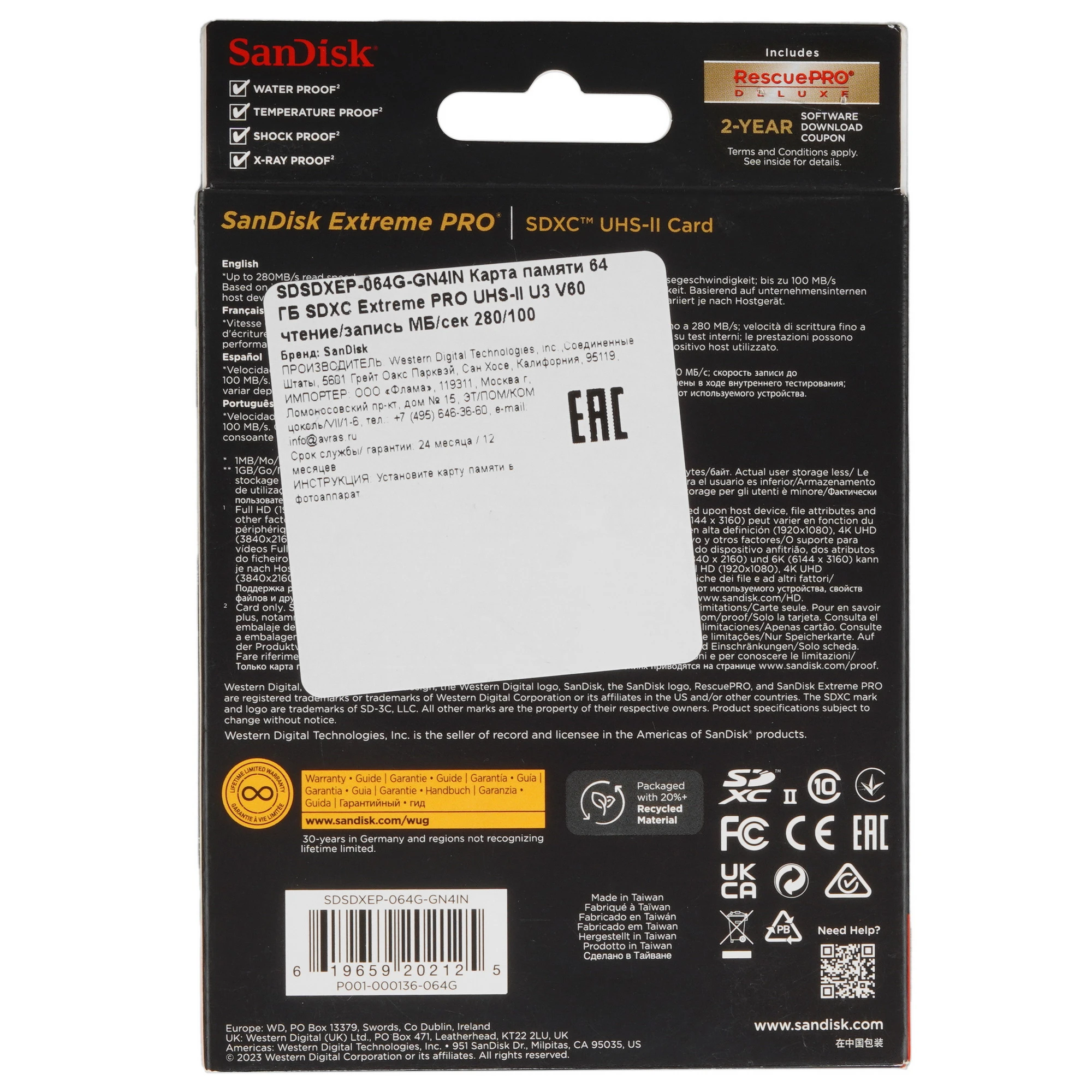 Карта памяти SanDisk Extreme Pro SDXC 64 ГБ [SDSDXEP-064G-GN4IN] обладает скоростью записи до 100 Мбайт/сек и чтения до 280 Мбайт/сек. Классы UHS Class 3 и Video Class 60 подходят для записи видео формата до 4к. SanDisk Extreme Pro SDXC 64 ГБ [SDSDXEP-064G-GN4IN] имеет объем 64 ГБ. Устройство защищено от рентгеновских лучей, от внешнего воздействия и водонепроницаемо.