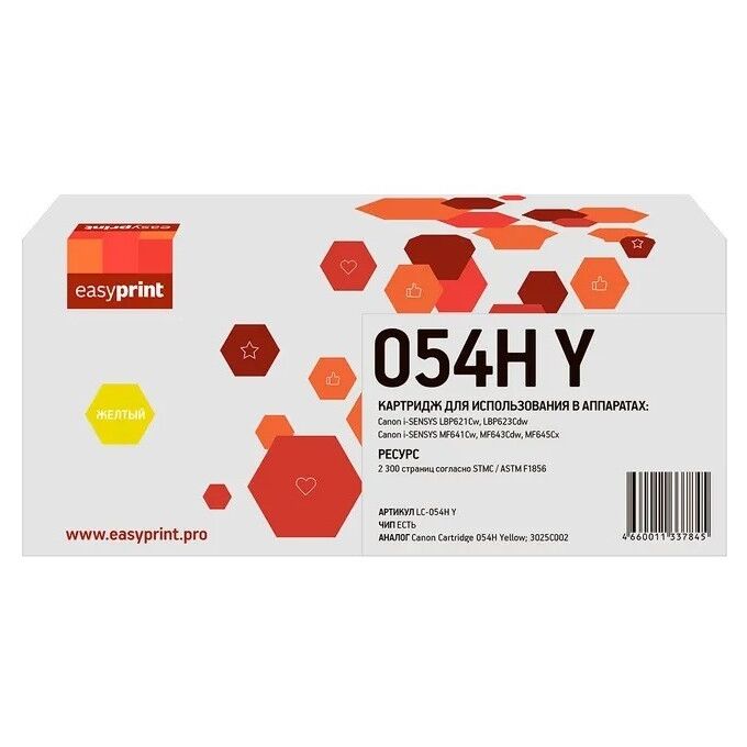 Картридж Easyprint 054HY (LC-054H Y) желтый для Canon i-Sensys LBP621Cw/LBP623Cdw/MF641Cw/MF643Cdw/MF645Cx (2300 стр.) с чипом