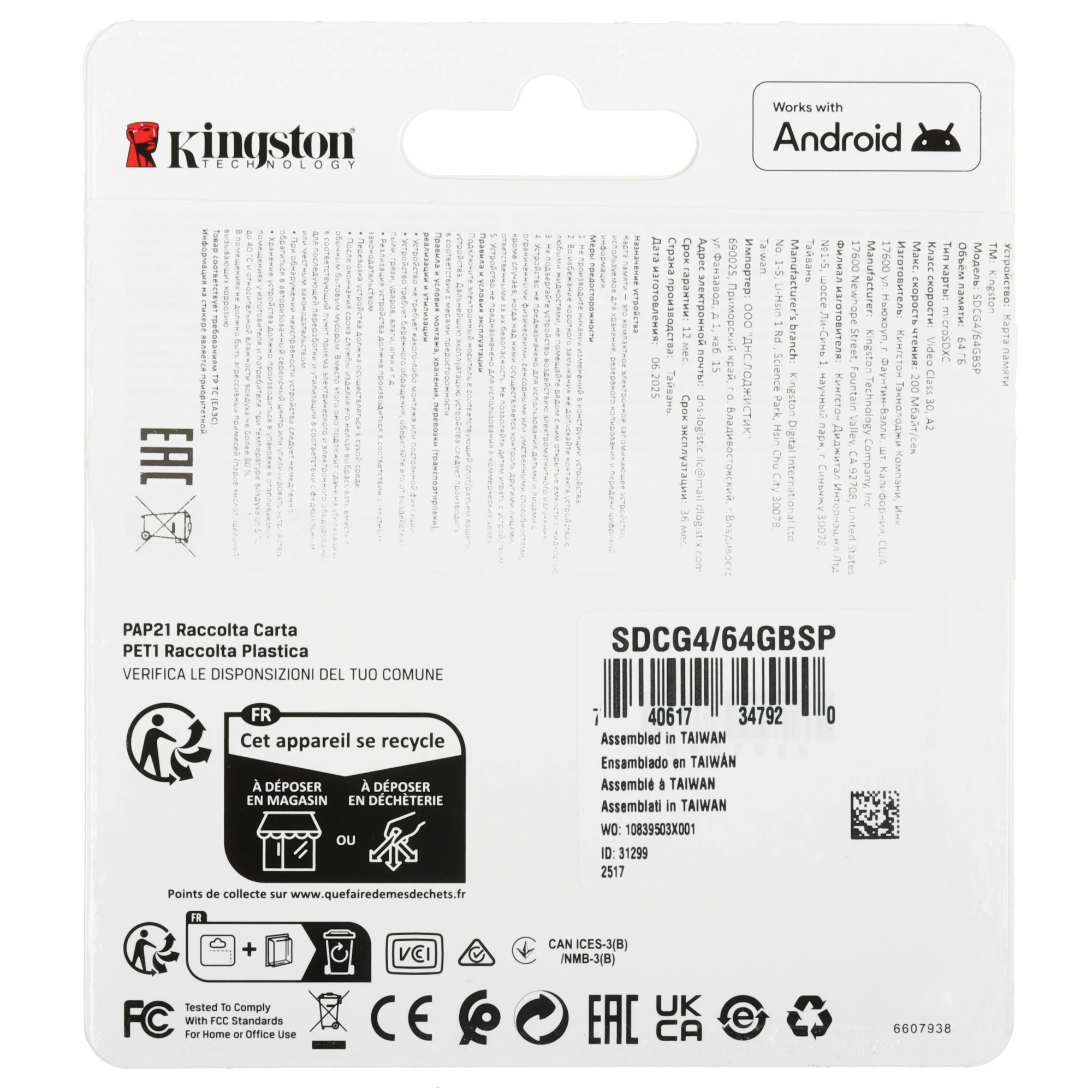 Карта памяти Kingston Canvas Go! Plus microSDXC 64 ГБ [SDCG4/64GBSP] соответствует классам скорости A2, Class 10, UHS Class 3 и Video Class 30. Изделие предназначено для смартфонов, фотокамер и других устройств.