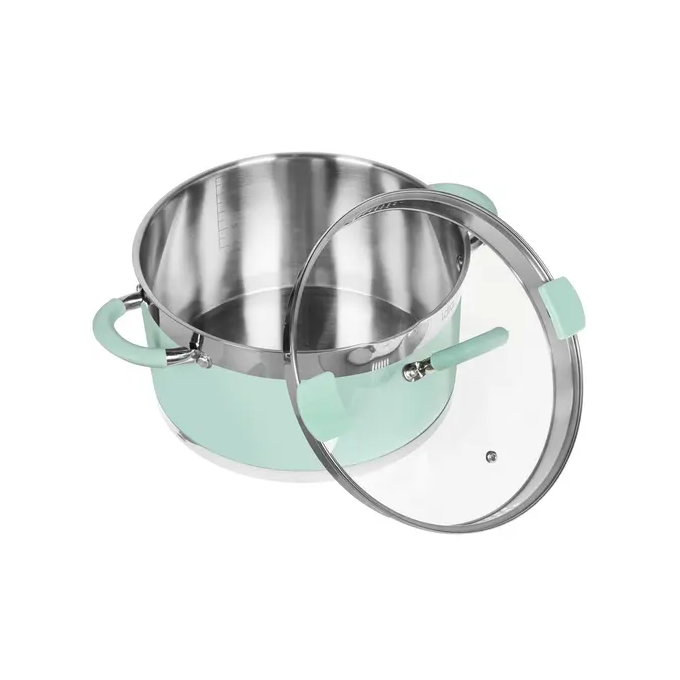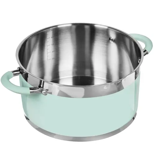 Кастрюля изготовлена из прочной и простой в уходе нержавеющей стали. Изделие имеет естественную серебристую расцветку, дополняется зелеными вставками и матовой двусторонней полировкой.