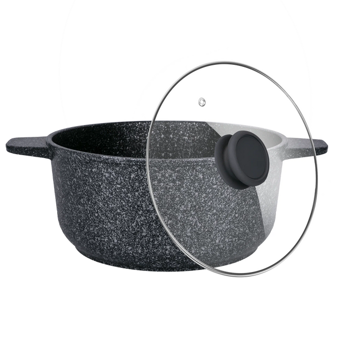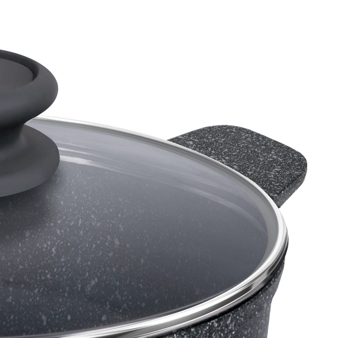 Пять слоев безопасного антипригарного покрытия, не меняет вкус и аромат еды. Кастрюля с эффектным мраморным покрытием и современной ручкой в универсальном сером цвете, будет отлично сочетаться с любой кухней.