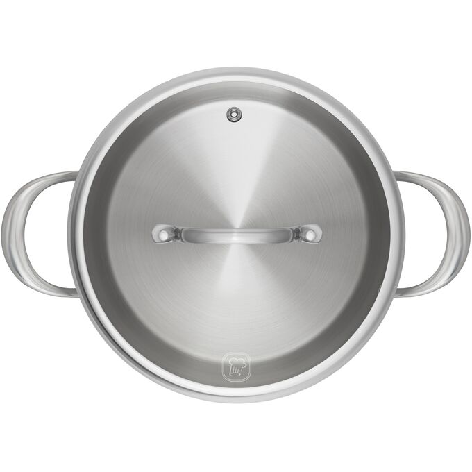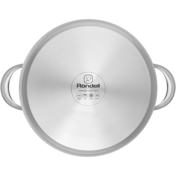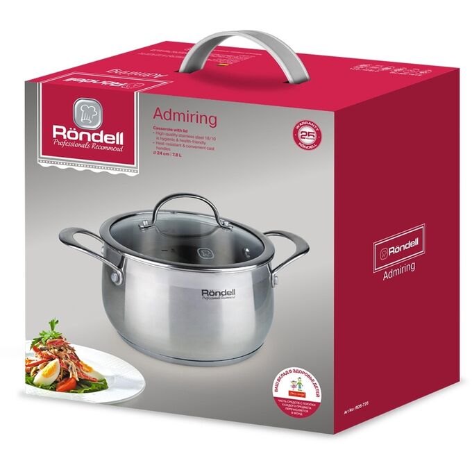 Технология: тройное вштампованное, затем вплавленное дно без воздушных полостей. Материал крышки: термостойкое стекло. Аксессуары: Литые, из нержавеющей стали. Преимущества: эргономичная форма ручек; Равномерный прогрев изделия; Округлая форма корпуса; Высокие стенки корпуса – большой литраж посуды
