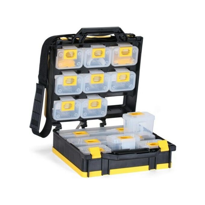 Кейс-органайзер КВТ К-01 76805 является удобным мобильным хранилищем мелких принадлежностей, инструментов, крепежных элементов и т.д. Прозрачный двусторонний пластиковый корпус открывается на 180°, внутри него размещены 15 разных по величине модулей. Благодаря съемному плечевому ремню с резиновым наплечником кейс легко и удобно транспортировать. Каждый модуль выполнен из прозрачного пластика, имеет удобную защелку на крышке и надежно фиксируется в органайзере пластиковой клипсой. Данный кейс можно повесить у себя в мастерской на любой вертикальной поверхности, для этого предусмотрены отверстия на его боковых стенках.