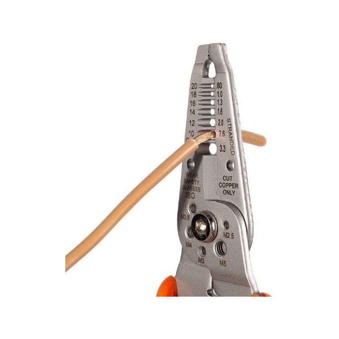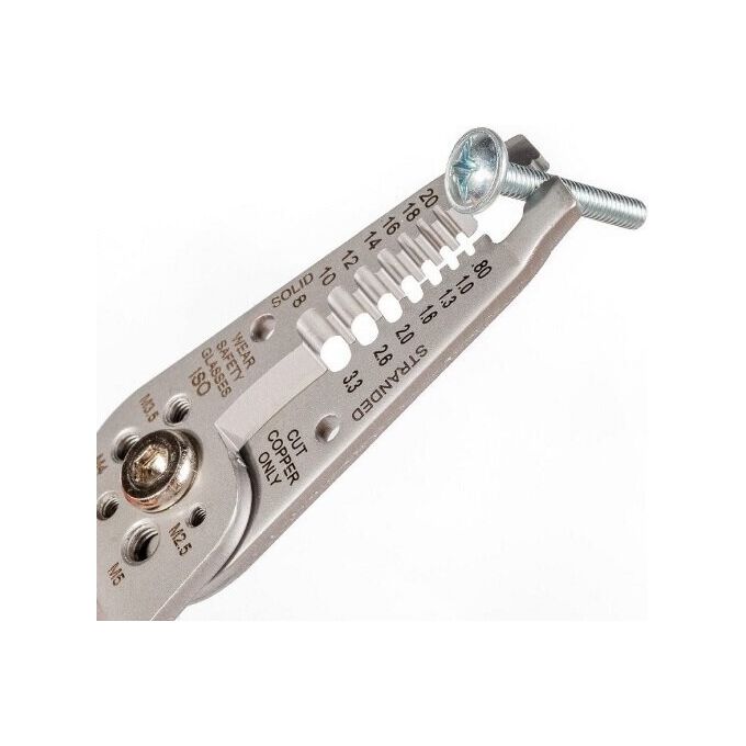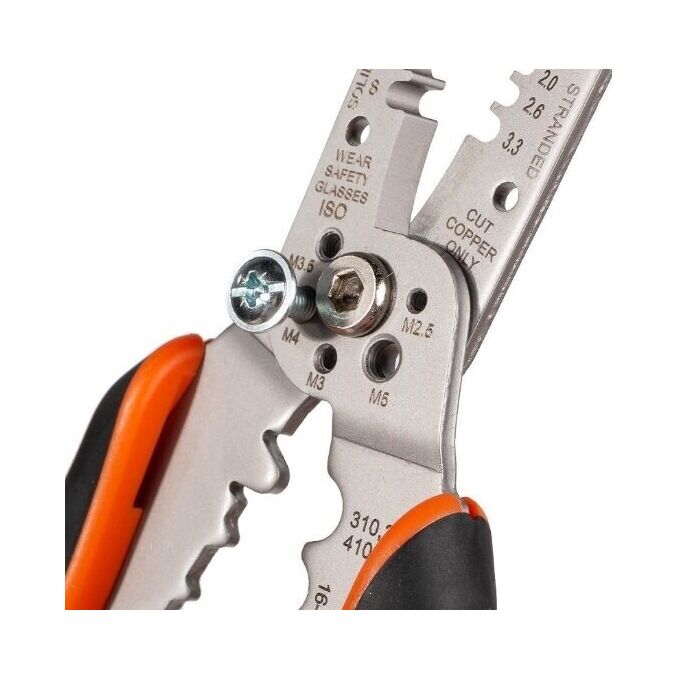 Инструмент для снятия изоляции КВТ WS-01D 55948 предназначен для работ с проводами различных размеров. Рабочая часть изготовлена из нержавеющей стали, отличается высокой прочностью. Семипозиционные прецизионно заточенные лезвия легко удаляют оболочку, режут винты М2.5, М3, М3.5, М4, М5, и производят опрессовку наконечников сечением 0.5–6 мм². Эргономичные рукоятки способствуют удобному использованию инструмента.