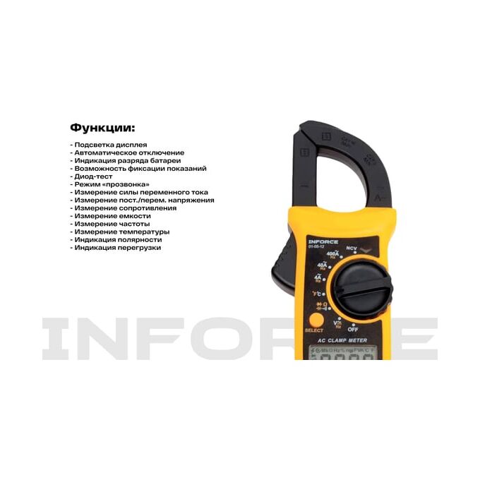 Токоизмерительные клещи Inforce 01-05-12 предназначены не только для тестирования в промышленных целях, но и для бытового использования. Появление бесконтактного детектора напряжения (NCV) упрощает задачу по поиску.