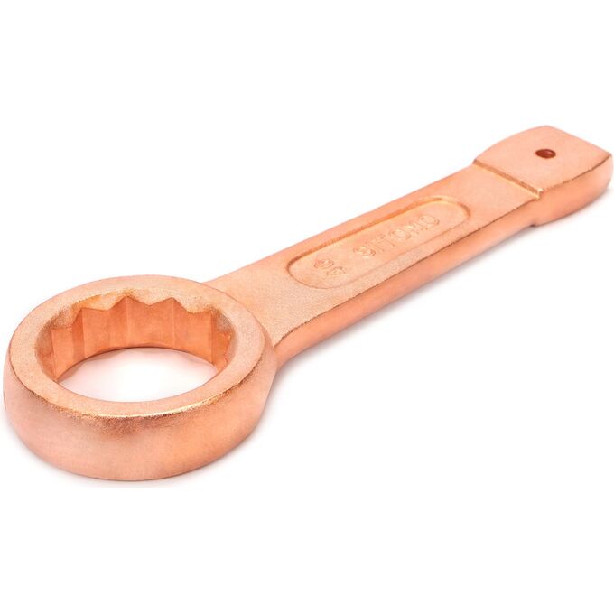 Двусторонний накидной ударный ключ предназначен для работ с резьбовыми соединениями в процессе ремонтных и монтажных работ. Инструмент выполнен из высококачественной стали, благодаря чему отличается прочностью и долговечностью. Омедненное покрытие обладает повышенной устойчивостью к высокотемпературному воздействию случайной искры. Ключ может применяться на предприятиях с наличием потенциально опасных сред, а также в быту. Одна из рабочих поверхностей ключа предназначена для ударных воздействий с целью увеличения усилия при работе с тугими крепежными соединениями.