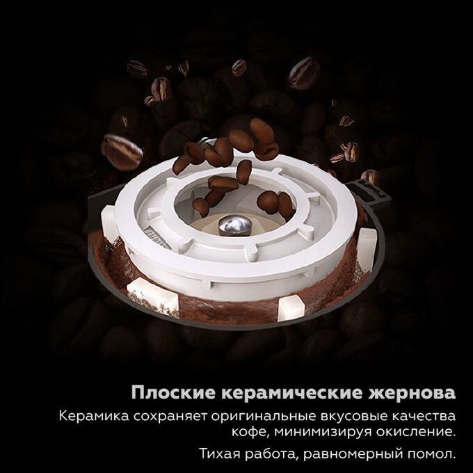 ■ Кофемолка с керамическими жерновами обеспечивает стабильный и однородный помол, сохраняя уникальный вкус и аромат кофе, не окисляет и не пережигает зерна при длительной работе.