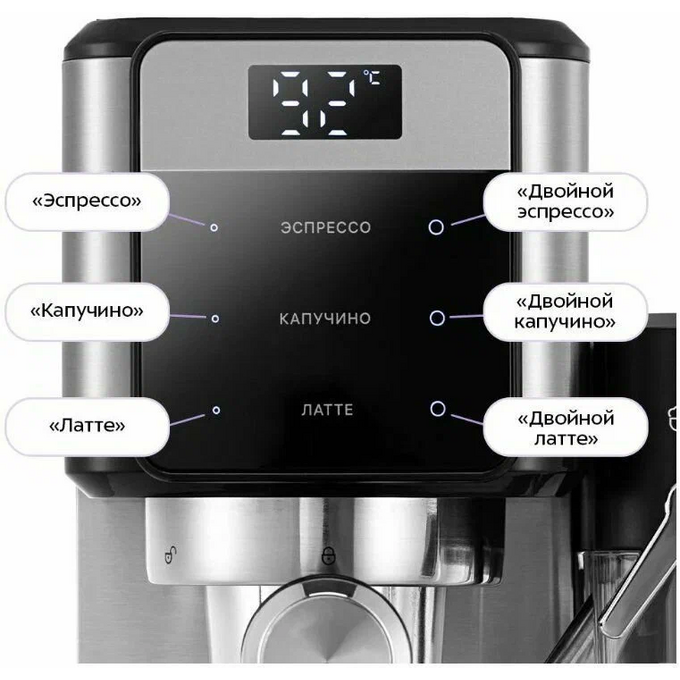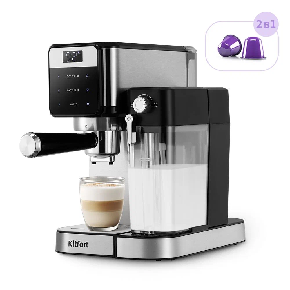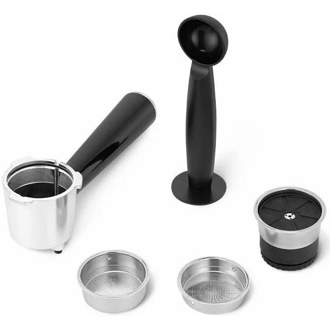 кофеварка — 1 шт, резервуар для воды — 1 шт, резервуар для молока — 1 шт, крышка резервуара для молока с металлической насадкой — 1 шт, трубка забора молока — 1 шт, поддон для капель с решеткой и поплавком — 1 шт, рожок — 1 шт, фильтр - 3 шт, мерная ложка-темпер — 1 шт, адаптер для капсул Nespresso с уплотнительным кольцом — 1 шт