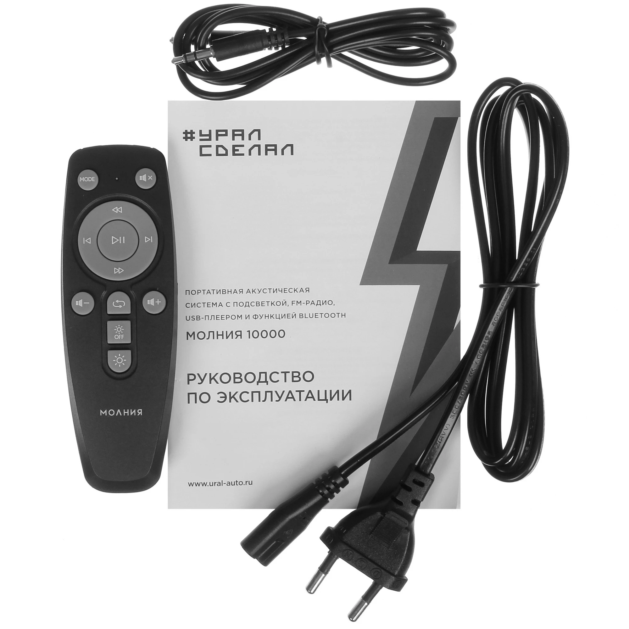 Портативная аудиосистема Урал Молния 10000 выполнена в пластиковом корпусе с многоцветной подсветкой. Есть USB-порт, AUX-вход и модуль Bluetooth для беспроводной связи с источником сигнала. Вы можете подключать 2 микрофона для работы в режиме караоке и слушать радио. Есть возможность подключения внешних накопителей или мобильных устройств, объединения колонок в более мощную и громкую стереосистему по технологии TWS. Аккумулятор выдерживает до 7 ч работы без подзарядки.