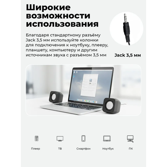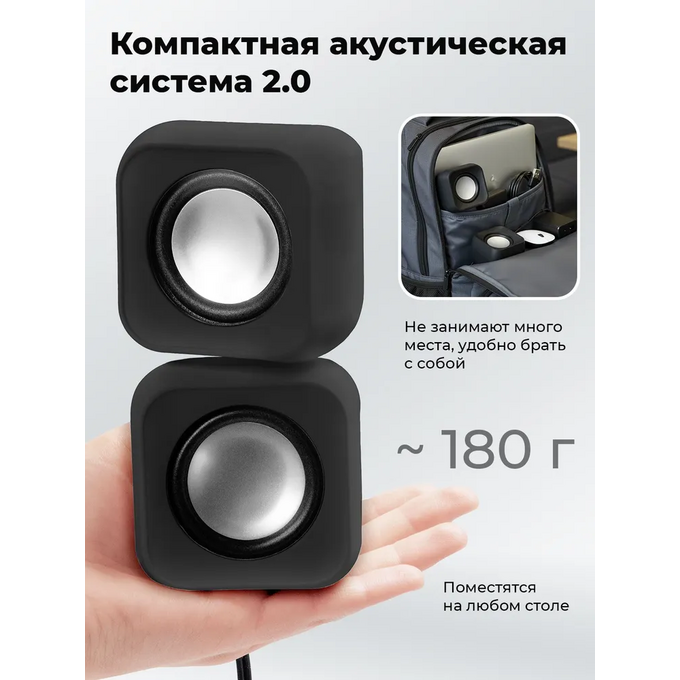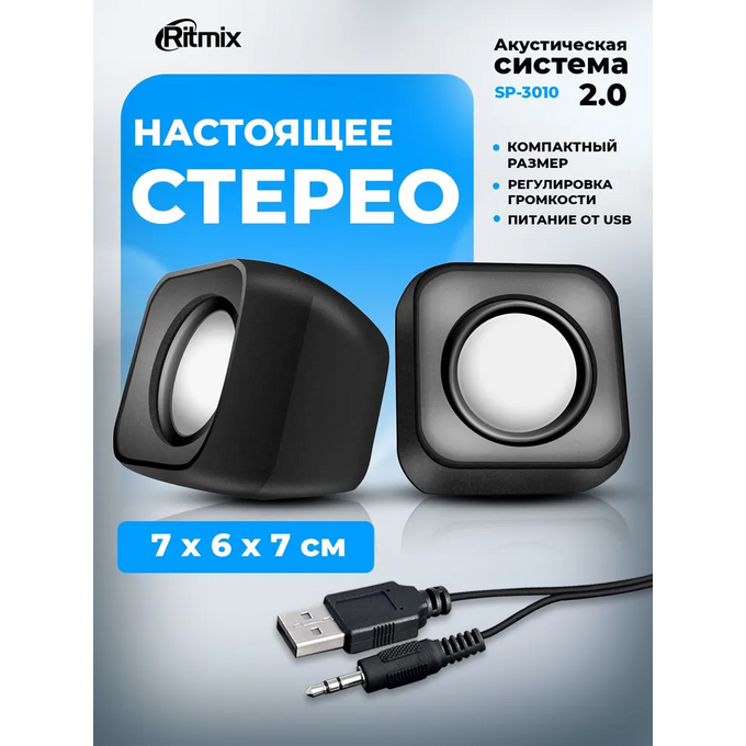 Колонки RITMIX SP-3010 black RMS 5Вт (2х2,5Вт), Диаметр динамиков 2’’, Частотный диапазон 100 -20кГЦ, Отношение сигнал/шум 80дБ