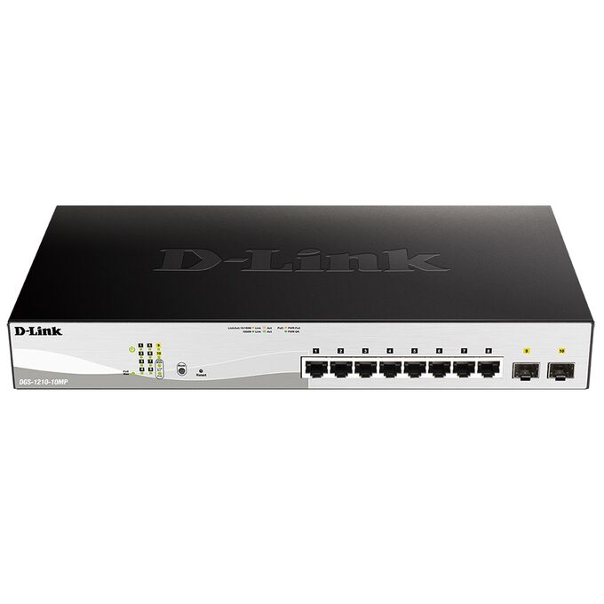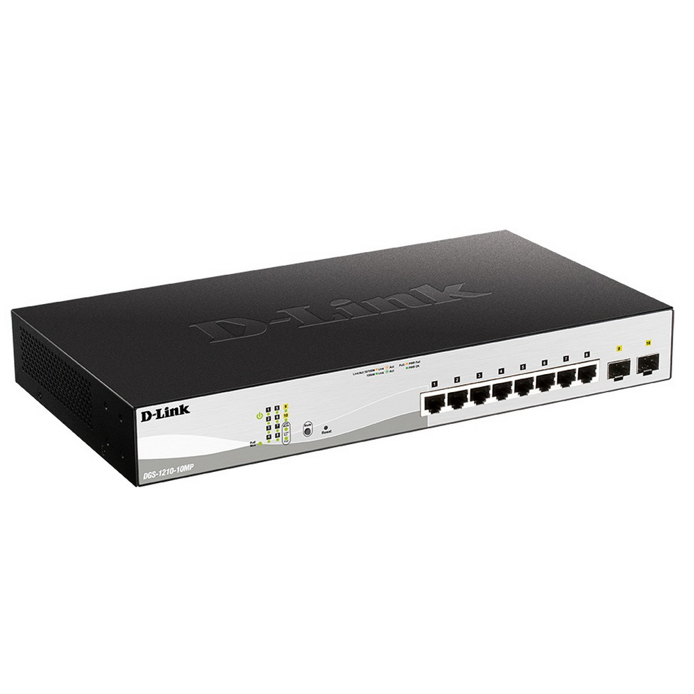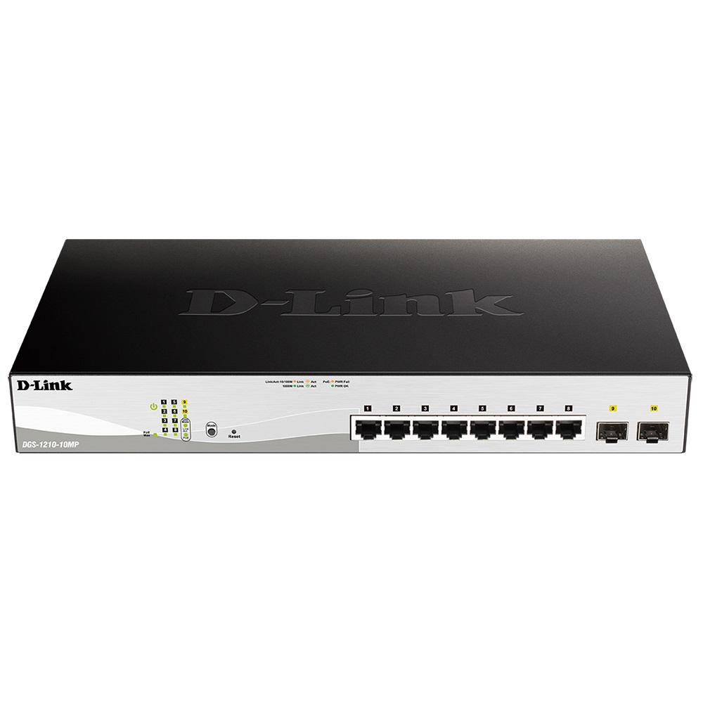 Коммутатор D-Link DGS-1210-10MP/FL1A, with 8 ports 10/100/1000Base-T and 2 ports 1000Base-X SFP (8 PoE ports 802.3af/802.3at (30 W)