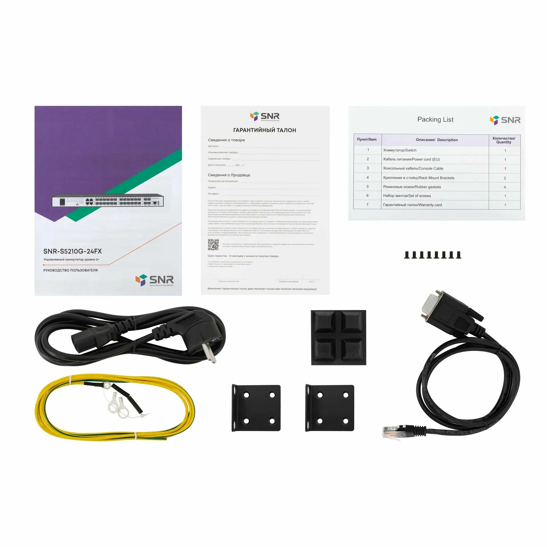 Коммутатор; Кабель питания; Консольный кабель; Кабель заземления; Крепления в стойку (2 шт.); Набор болтов; Гарантийный талон.