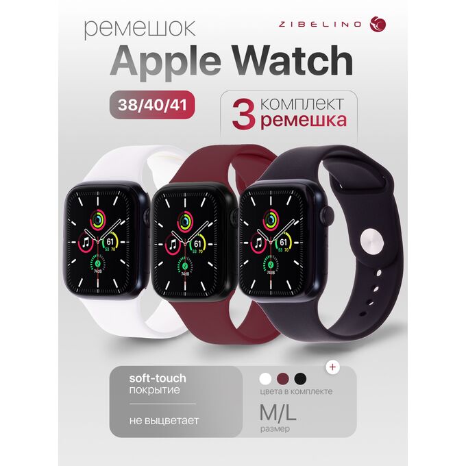 Комплект 3шт ремешок силиконовый для Apple Watch 38mm, 40mm, 41mm (размер M/L) черный + белый + темно-красный (Эпл Вотч 38 мм 40 мм 41мм)