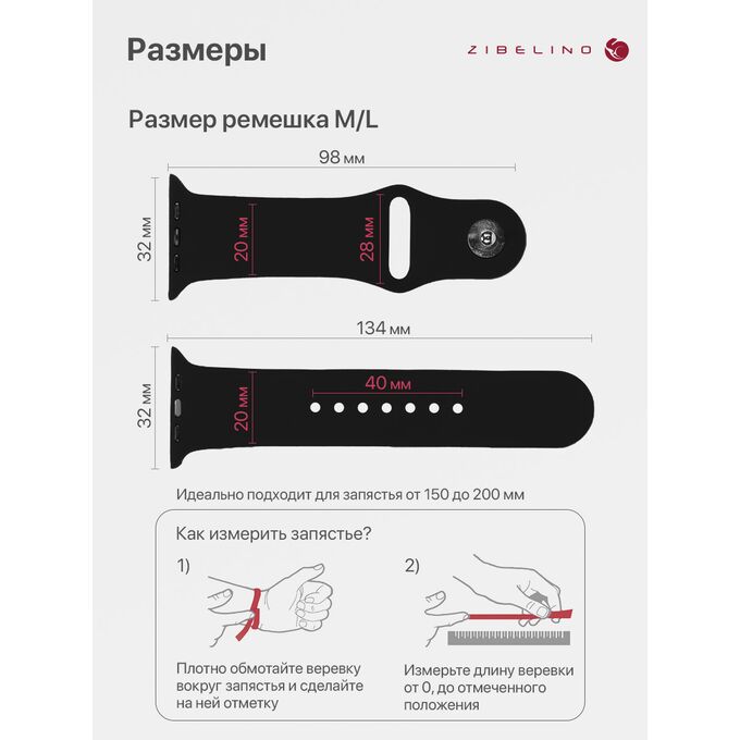 Ремешок размера M/L подходит для запястья обхватом от 15 до 20 см. Размер ремешка 232x20x2мм.