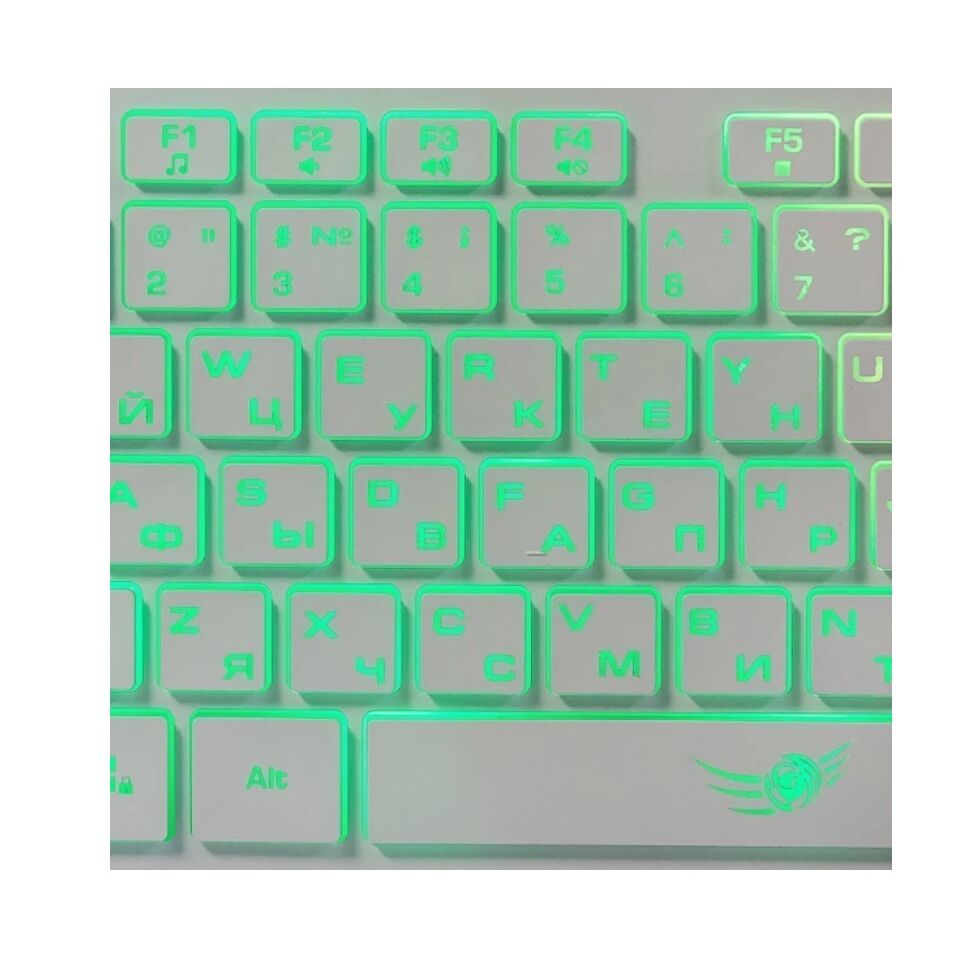 Корпус клавиатуры белый пластик. Серая латиница, Серая кириллица. Клавиши с белой рабочей поверхностью и просвечивающими боковинами. Символы просвечиваются при включенной подсветке