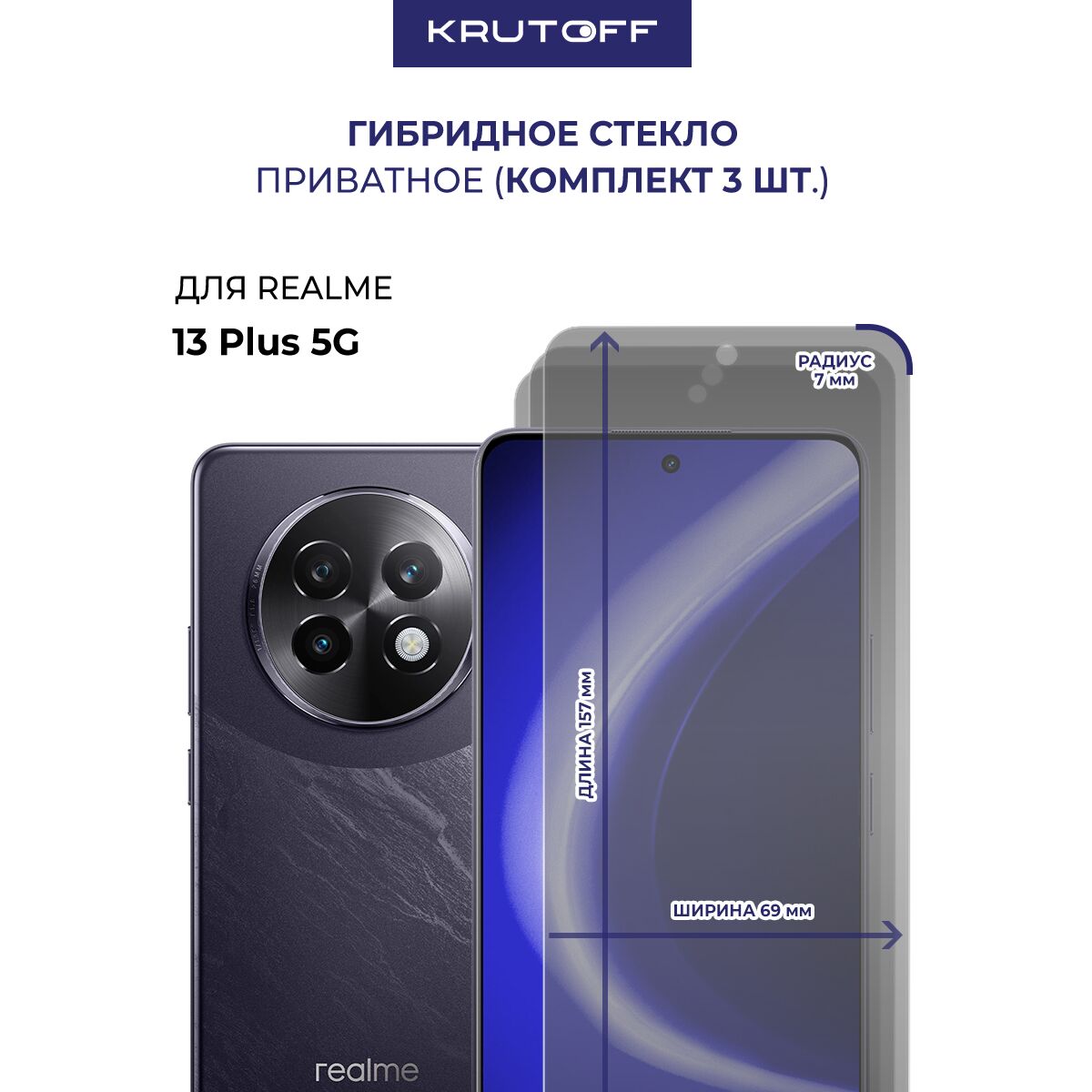 Комплект из 3-х защитных гибридных стекол Антишпион Krutoff для Realme 13+ 5G