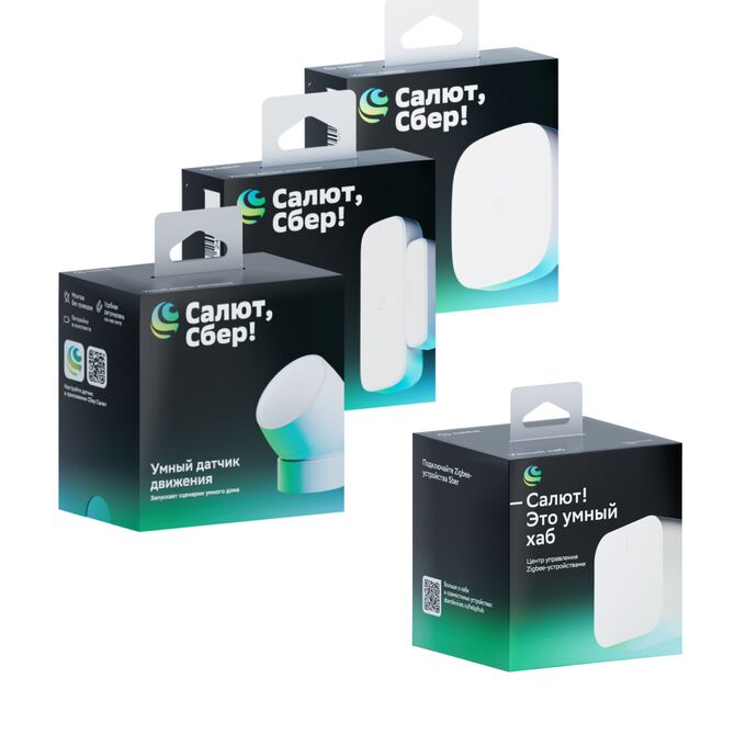 Умный хаб Sber, Умный датчик движения Sber, Умный датчик открытия Sber, Умная кнопка Sber, батарейки, руководство пользователя, коробка