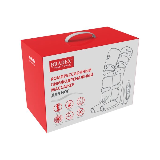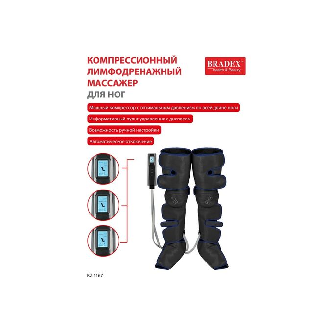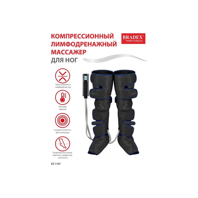 Компрессионный лимфодренажный массажер для ног BRADEX прогрев коленей, длинные манжеты, черный KZ 1167 – профессиональное устройство для проведения прессотерапии и лимфодренажа ног с дополнительной функцией подогрева в области коленей в домашних условиях.