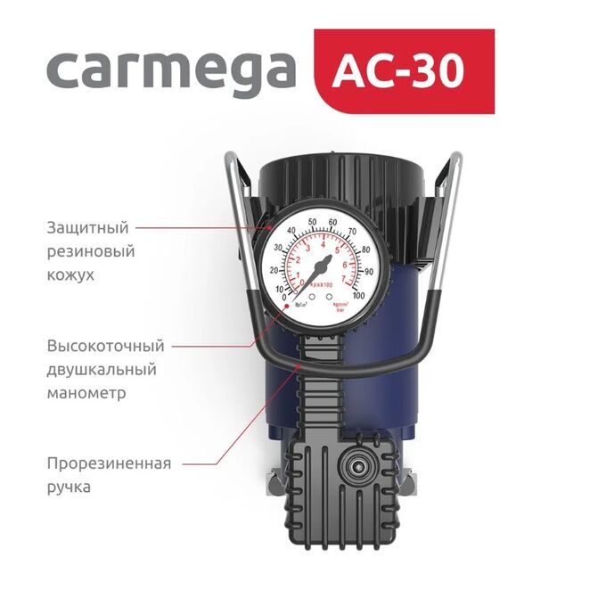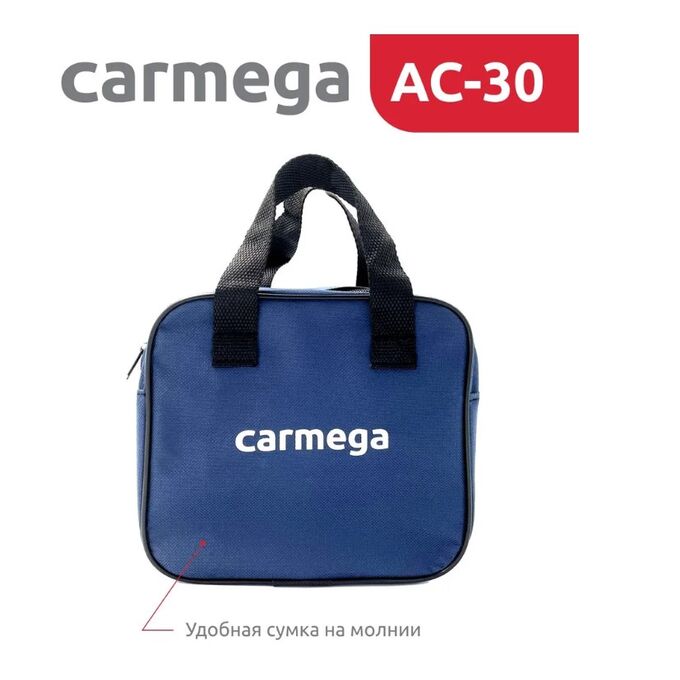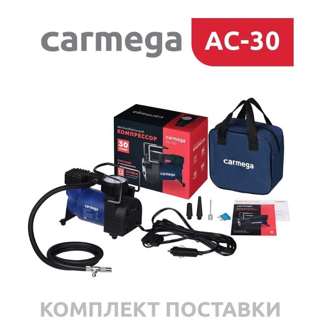 Надежный компрессор CARMEGA AC-30 с легкостью накачает не только колесо Вашего автомобиля, но и поможет подкачать мяч, резиновую лодку или матрас. Для этого в комплекте предусмотрен набор переходников.