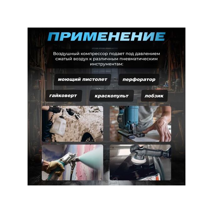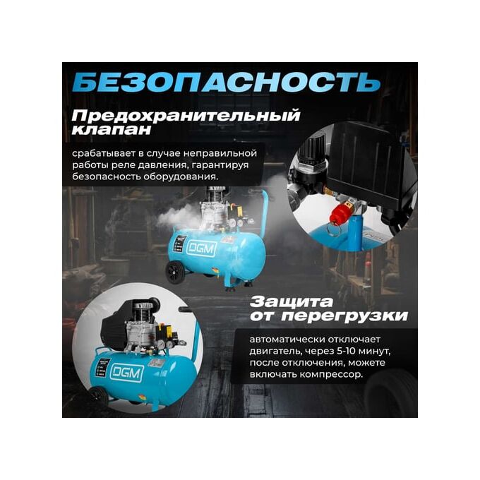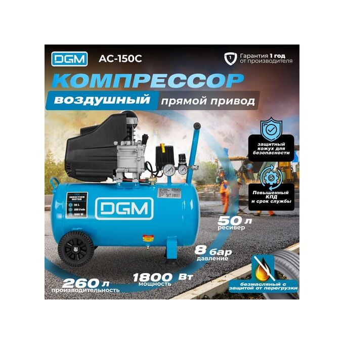 Компрессор DGM AC-150C (DG2720-1) - предназначен для сжатия воздуха и использования в различных промышленных и бытовых целях. Тепловая защита электродвигателя обеспечивает безопасность и предотвращает перегрев двигателя в случае его перегрузки или нештатной работы. Имеется 2 быстросъемных выхода, для подключения несколько инструментов.