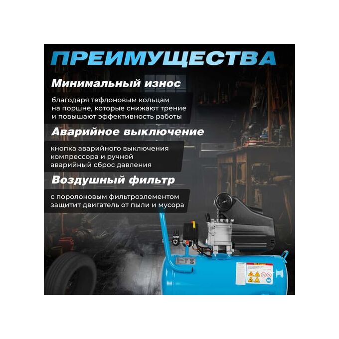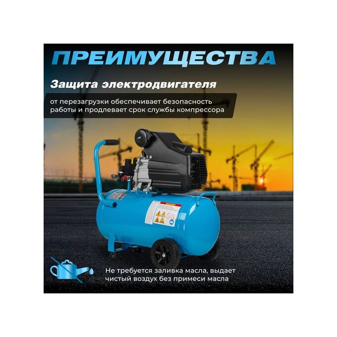 Контрольный глазок для проверки уровня масла для удобного контроля и доступа к маслу. Воздушный фильтр с поролоновым фильтроэлементом гарантирует чистоту и качество сжатого воздуха, защищая инструменты и устройства от попадания пыли и грязи. Имеется ручка для транспортировки облегчает перемещение компрессора и делает его более мобильным и удобным в использовании.