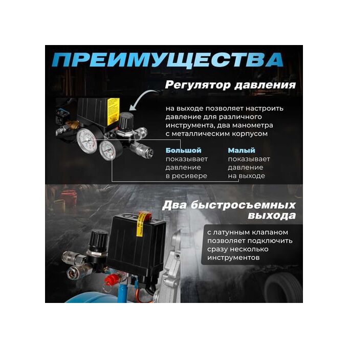 Манометр давления в ресивере и на выходе позволяет контролировать и регулировать давление сжатого воздуха. Регулятор давления позволяет настроить и поддерживать требуемое давление воздуха в соответствии с конкретными задачами.
