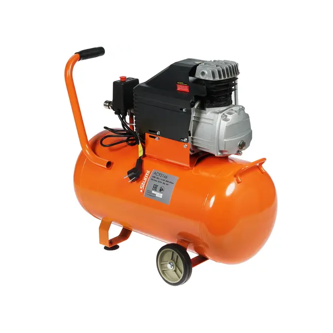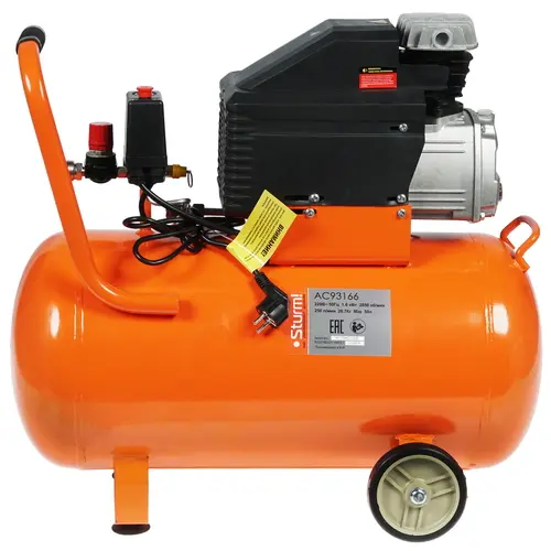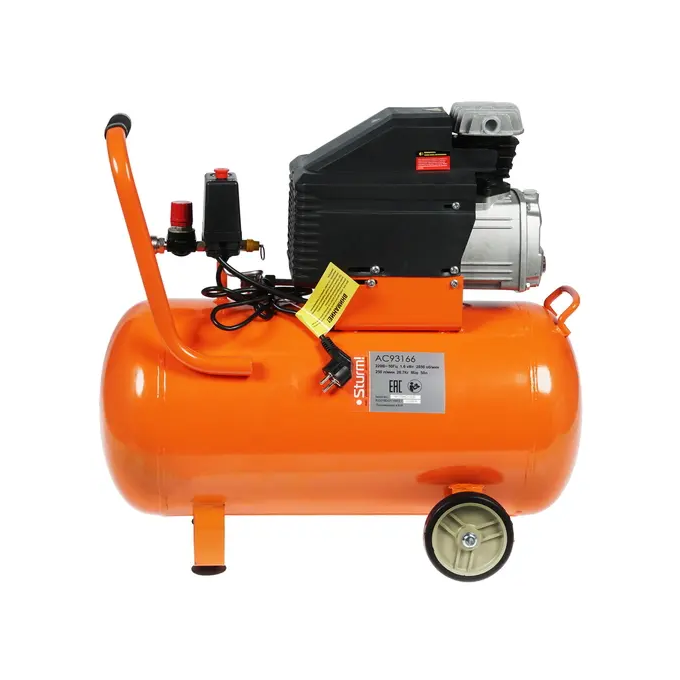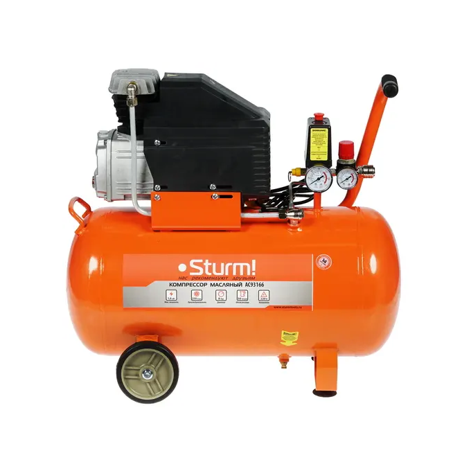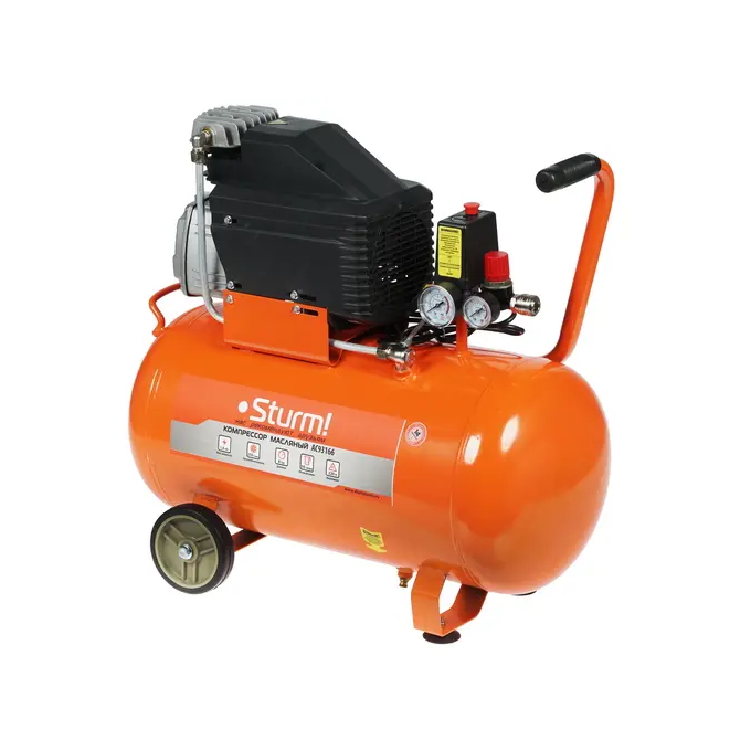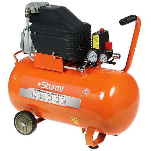 Масляный компрессор Sturm AC93166 предназначен для питания различных пневматических инструментов сжатым воздухом. Данный компрессор используется для выполнения бытовых работ, связанных с использованием сжатого воздуха. Агрегат оснащен двигателем мощностью 1600 Вт и ресивером емкостью 50 литров. Производительность компрессора составляет 250 литров в минуту. Транспортировочная рукоятка и большие колеса предназначены для легкой перевозки агрегата по рабочей площадке.