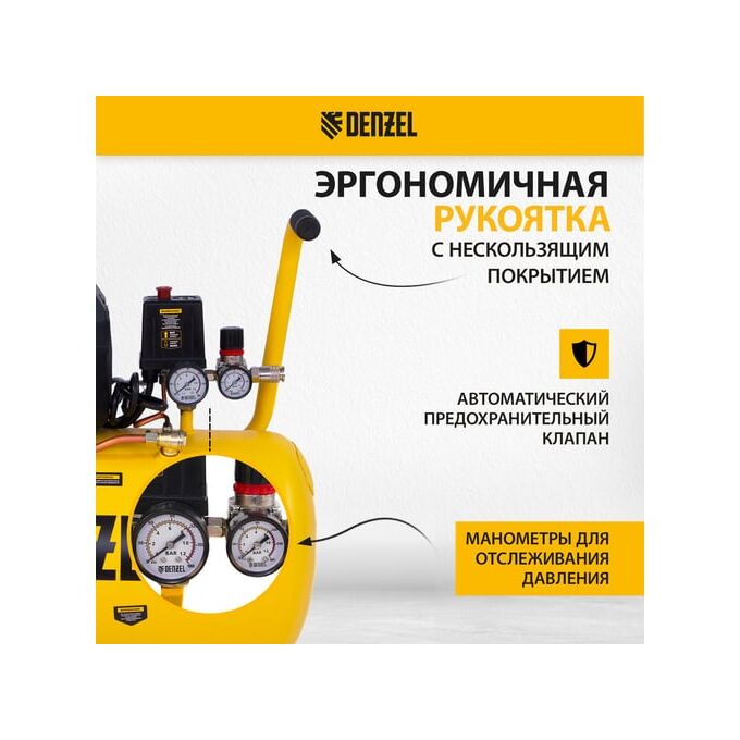 Воздушный компрессор DENZEL DK1800/50,Х-PRO 1,8 кВт, 280л/мин, 50л 58068 имеет 2 манометра для контроля давления сжатого воздуха.