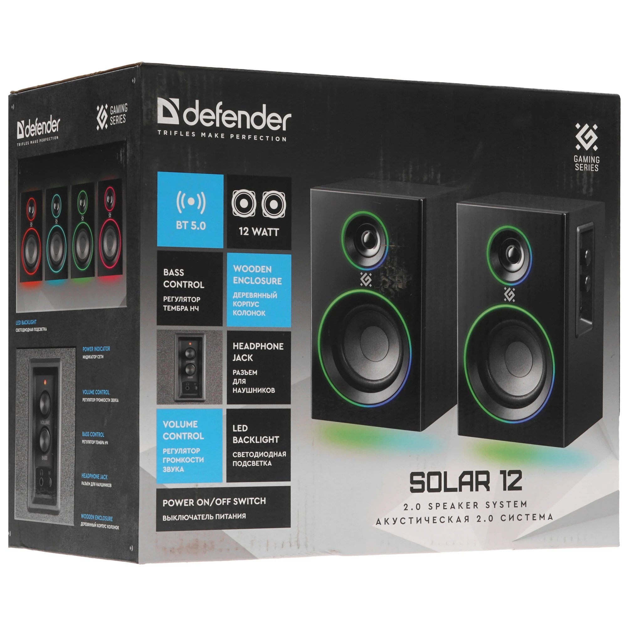 Геймерские компьютерные колонки Defender Solar 12 в стильном деревянном корпусе с эффектной светодиодной подсветкой и функцией Bluetooth. Эти колонки созданы для того, чтобы обеспечить высокий уровень звука на всем спектре частот, что делает их идеальными для игр, музыки и фильмов. На боковой панели расположены удобные элементы управления, включая регулятор громкости со встроенным выключателем питания, разъем для подключения наушников, кнопку управления режимами подсветки и переключения между AUX и Bluetooth. Также предусмотрена регулировка тембра низких частот, что позволяет настроить звук под ваши предпочтения. С поддержкой Bluetooth 5.0, колонки обеспечивают надежное соединение и качественную передачу звука без проводов. С помощью регулятора громкости вы можете легко изменять уровень звука одним движением, не переключаясь на управление вашим плеером. Индикатор сети и выключатель питания делают использование колонок еще более простым и интуитивным. Эти колонки - отличный выбор для геймеров и ценителей качественного звука, которые хотят сочетать стильный дизайн с высокой производительностью!