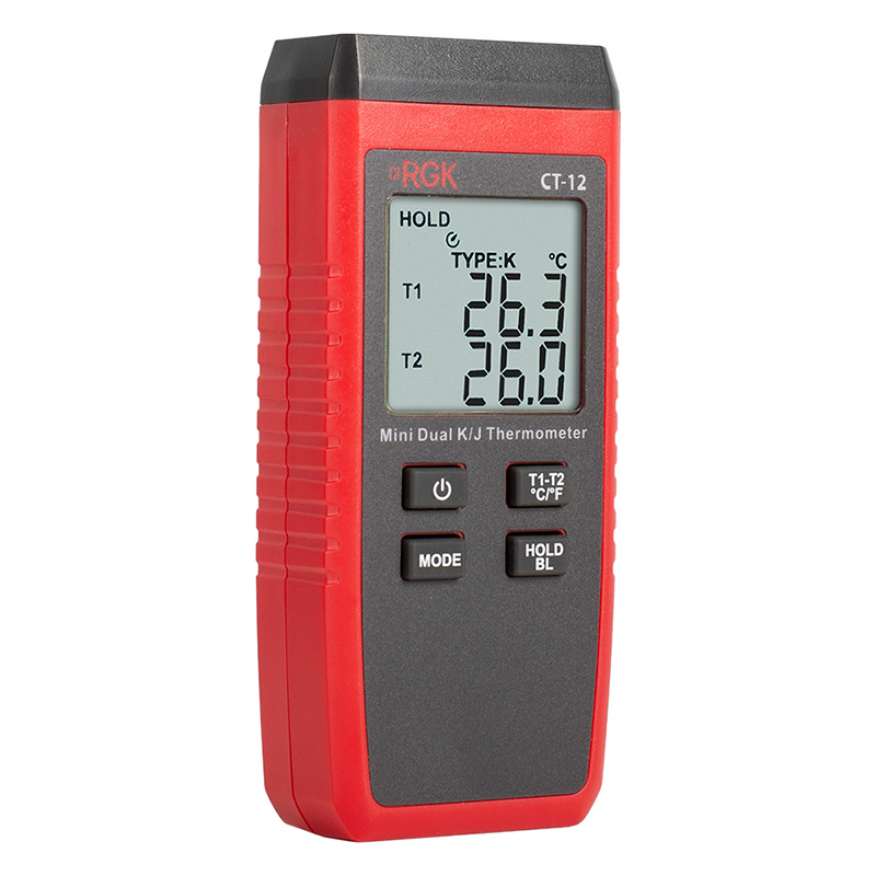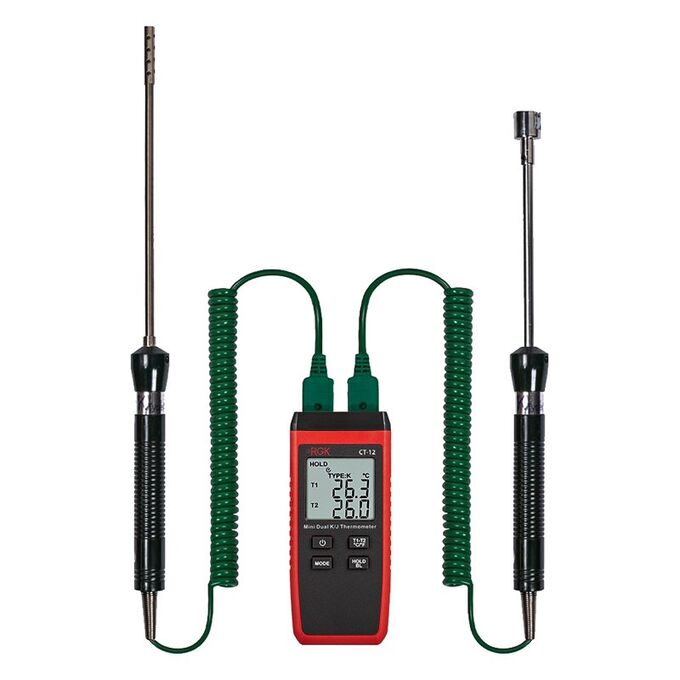 Термометр RGK CT-12 способен измерять температуру от - 40 до + 500 °C, если используется зонд TR-10S из комплекта. Модель оснащена 2 гнездами для подключения выносных датчиков, которые оснащены функцией определения разности между каналами. Комплект зондов позволяет измерять прибором как жидкости, так и газообразные вещества.