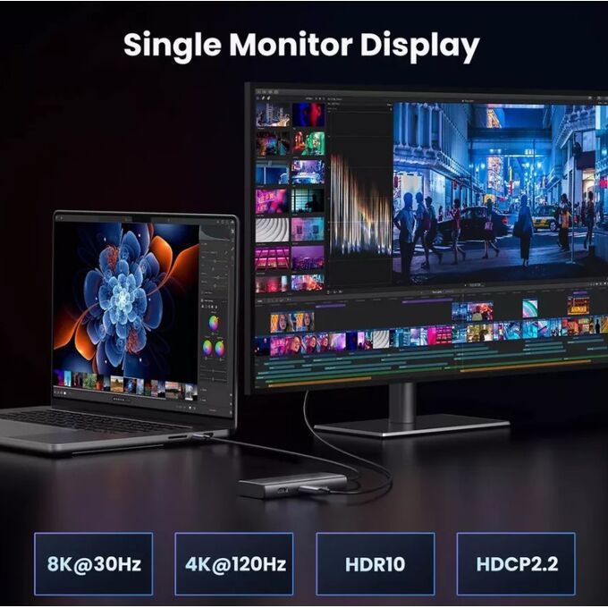 Док-станция UGREEN с двумя мониторами предлагает широкий спектр возможностей подключения, включая два порта HDMI, порт USB-C PD мощностью 100 Вт, порт передачи данных USB-C 5 Гбит/с и два порта передачи данных USB-A. Наслаждайтесь двумя дисплеями с разрешением 4K при 60 Гц для эффективной межэкранной многозадачности и творческих рабочих процессов. Примечание. macOS не поддерживает режим MST. Порт HDMI 2 обеспечивает потрясающее разрешение 8K при 30 Гц с потрясающей детализацией и яркими цветами, улучшая качество визуального контента. Порт USB-C PD поддерживает сквозную зарядку мощностью до 85 Вт, что позволяет зарядить MacBook Pro 13 с низкого уровня до 73 % всего за час.