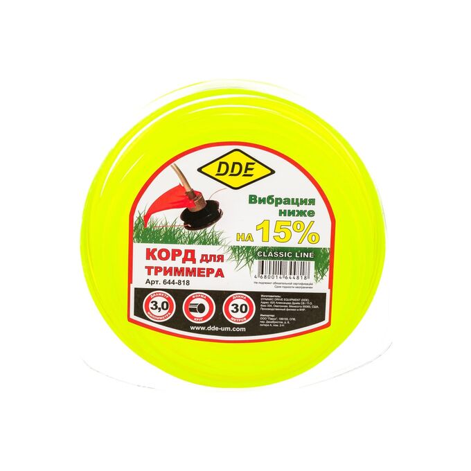 Корд триммерный DDE 644-818 применяется при работе с триммерами для кошения травы. Является режущим элементом и заправляется в триммерную головку. Изготовлен из износостойкого сополимер-термопласта марки Luran S. Выдерживает интенсивную эксплуатацию на высоких оборотах. Обладает пониженной вибрацией.