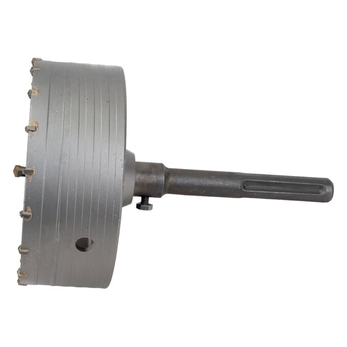 Коронка SDS-Max по бетону буровая в сборе 150 мм для перфоратора Strong CTK-06800150 – высокопрочная насадка для перфоратора, имеющая цилиндрический корпус с твердосплавными зубьями и центрирующим сверлом.
