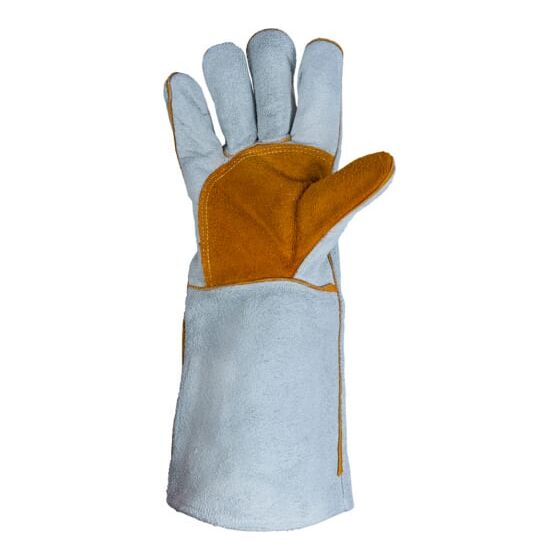 Кожаные промышленные краги увеличенной длины (400 мм). Выполнены из спилковой кожи c подкладкой из хлопчатобумажной ткани и флиса, с дополнительной накладкой на ладони.