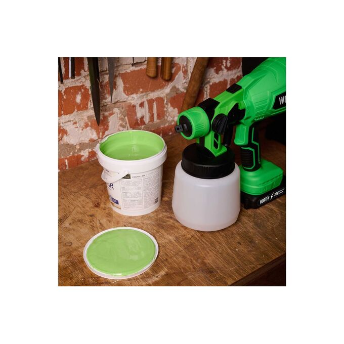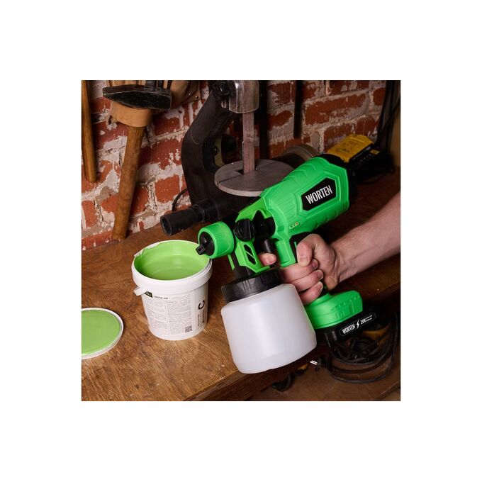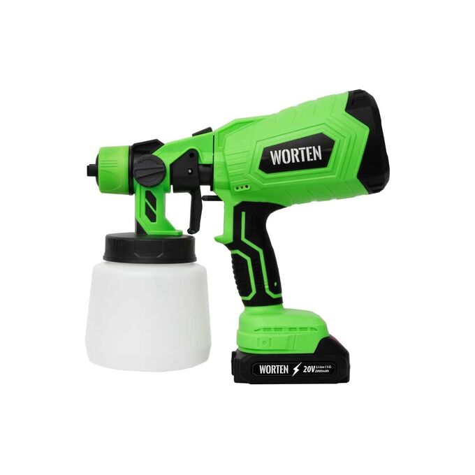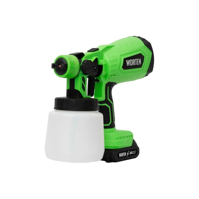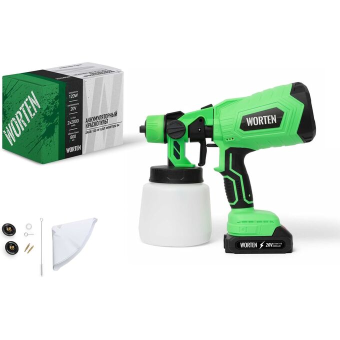 Аккумуляторный краскопульт WORTEN, 1х2 Ач, 120W 0,8л используется для обработки поверхности водно-меловыми и водно-известковыми составами при строительно-отделочных работах, при опрыскивании и побелке садов, дезинфекции помещений. Краскопульт подходит для рабочих поверхностей небольшого и среднего размера. Технология HVLP, реализованная в краскораспылителе, обеспечивает высокую производительность при низком давлении. Подходит для бытового использования в помещениях и на открытом воздухе. Ход курка распылителя регулируется ограничительным винтом, при этом нормируется подача краски.