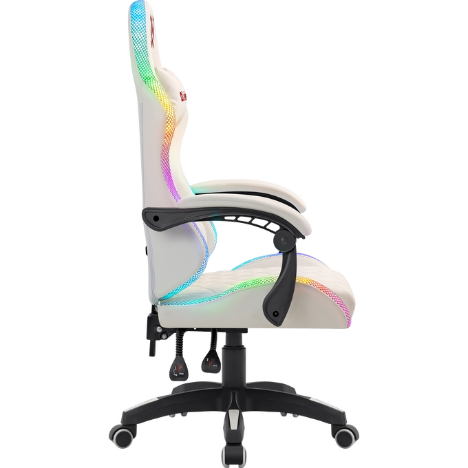 Стильное и удобное игровое кресло со встроенной RGB подсветкой. Кресло оснащено шейной и поясничной подушками, мягкими подлокотниками, а также механизмом, регулирующим уровень наклона спинки.