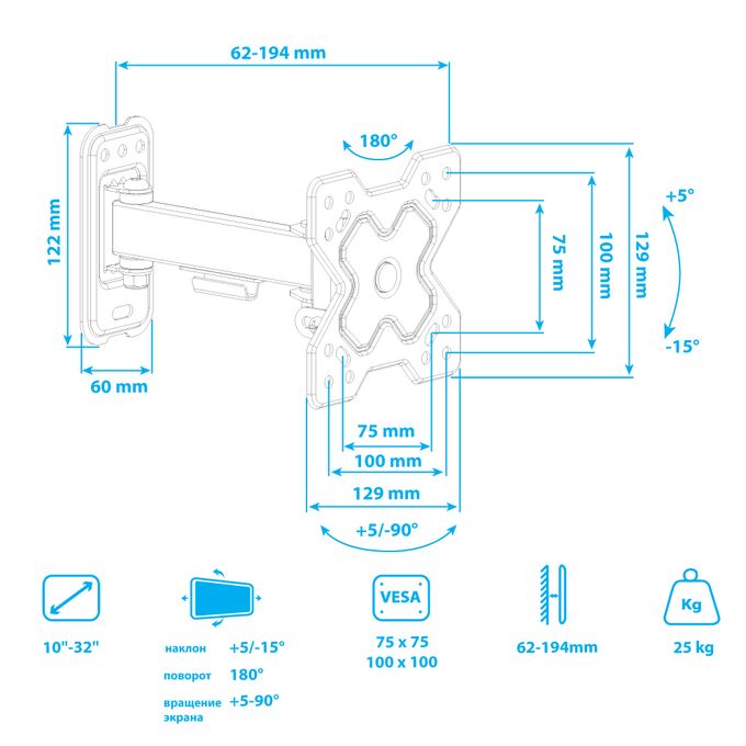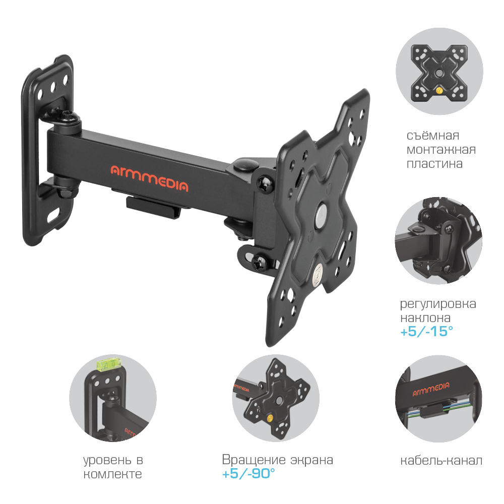 Надежная стальная конструкция, Универсальный - телевизор на кронштейне можно наклонить, повернуть и сдвинуть к стене, Легкий монтаж телевизора - благодаря наличию съемной монтажной пластины, Кабель-канал, Вращение экрана +5° -90°